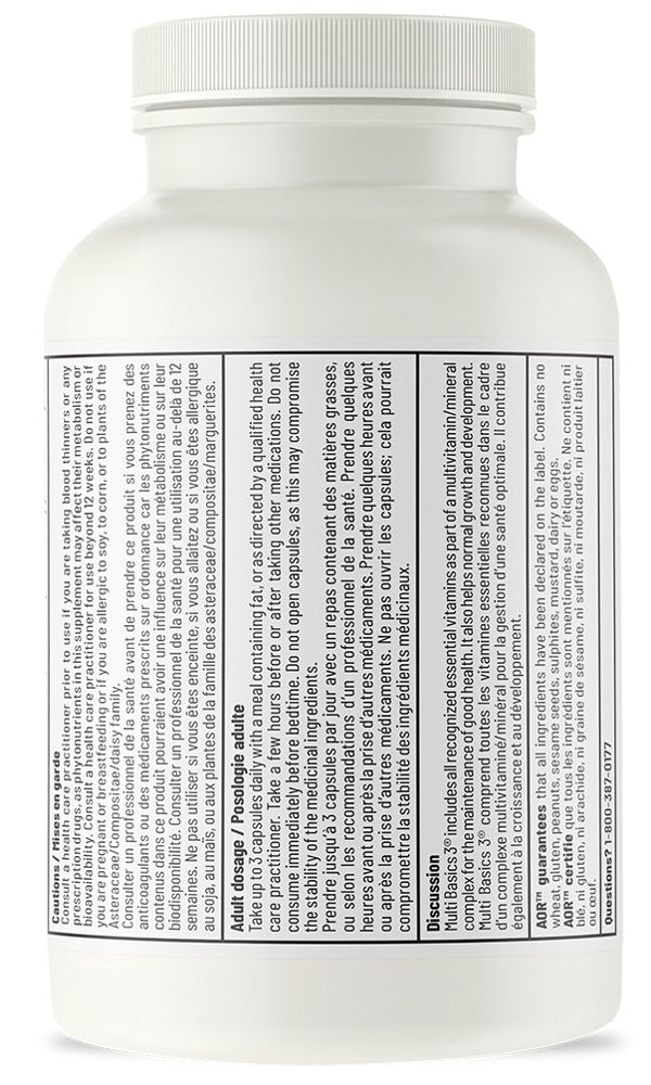 AOR - Multi Basics 3 - 90 Capsule(s) - NPN: 80025569 -- Multi Basics 3® provides optimal doses and balanced ratios of all the recognized essential vitamins and minerals in high quality forms supported by research, all in just three capsules a day.A balanced and well-designed multivitamin is fundamental to any supplement regimen. Multivitamin and mineral formulations are an excellent way to meet your daily nutrition requirements of all essential nutrients, providing a foundation on which to build your path to good health. While some nutrients like vitamins A and E are better absorbed and more effective in their natural forms, others are better absorbed in synthetic supplement form, such as folate and other B-vitamins. Some nutrients like zinc and copper must be delivered in balanced ratios so as not to disrupt certain bodily functions. Too much of some nutrients like vitamin B2 can actually inhibit absorption of other nutrients, while too little is just ineffective. Multi Basics 3® takes all of these factors into consideration, creating a carefully formulated, balanced and effective multivitamin that delivers many more benefits than a typical one-a-day multivitamin.AOR AdvantageAORs Multi Basics 3® is formulated to deliver the most fundamental nutrients in active forms in the fewest capsules possible. Multi Basics 3® includes all recognized essential nutrients and delivers them in superior forms, such as the inclusion of the complete E complex and the menatetrenone form of vitamin K.