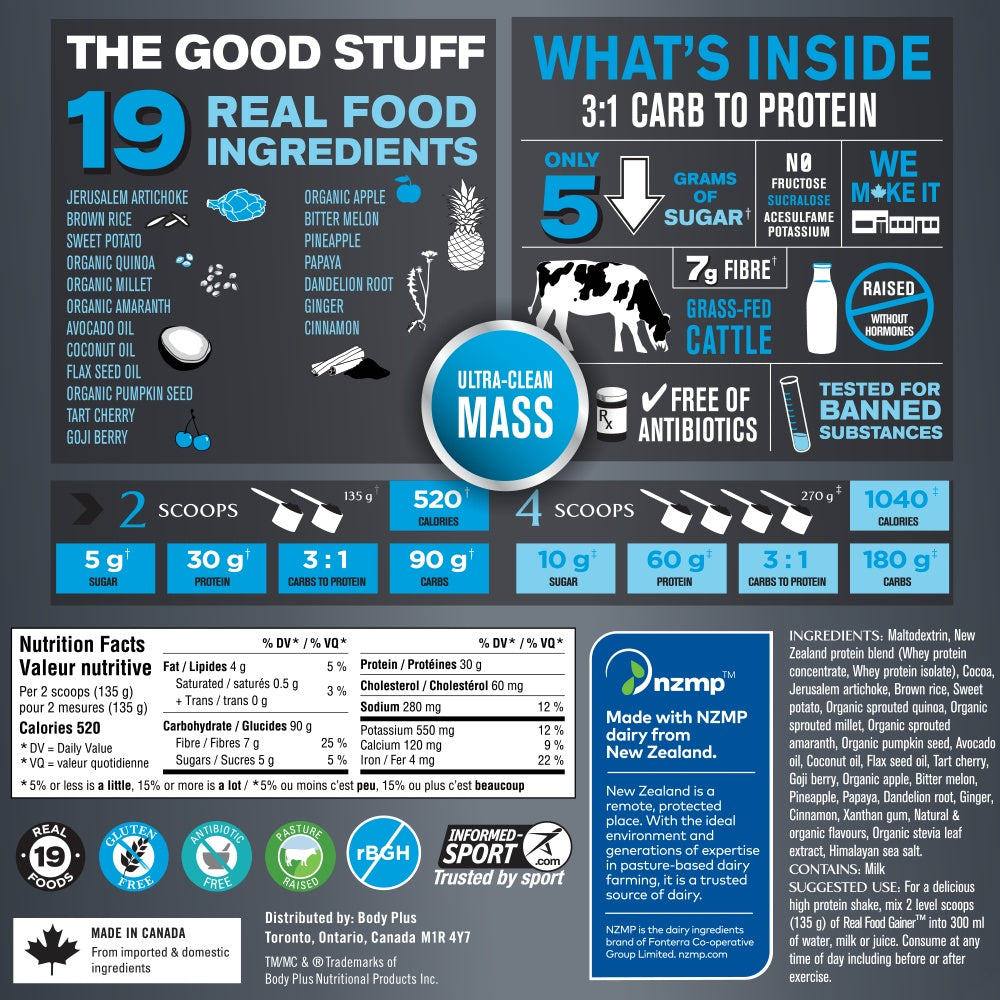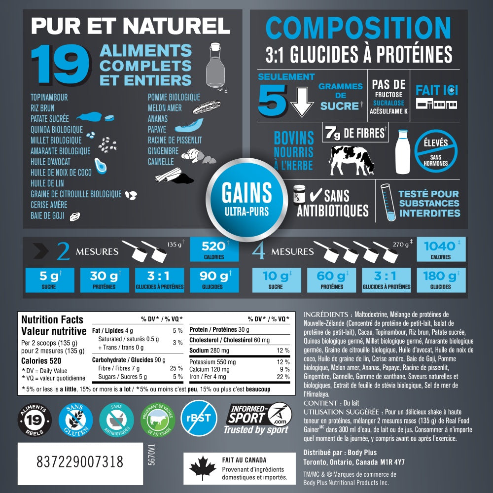 PROGRESSIVE - SPORT Real Gainer - 2.27 Kilogram(s) - NPN: 00000000 -- AS A HARD GAINER OR HIGH-INTENSITY ATHLETE, YOU NEED A HIGH DOSE OF CALORIES TO RECOVER, GROW, AND/OR MAINTAIN YOUR SIZE AND STRENGTH.Why? The body is quick to break down and waste away your hard-earned muscle when its functioning at a deficit. The best plan of action? A Gainer. BUT Not all gainers are created equally. Sure - they all load you up on calories, but quick and dirty calories are usually the norm. While junk calories may pack on pounds, they arent so great when it comes to your health and getting quality gains. Think of it this way you could get big eating just donuts. But, itll compromise your health and performance, leaving you weak, tired, and unmotivated. Until now, all gainers have followed the same philosophy: quick & dirty calories to add pounds on the scale with no added health benefits.Progressive Sport Real Food Gainer is the right way to gain mass and feed your hungry body, without compromising nutrition. It features authentic New Zealand whey proteins, complex carbs, whole grains, fruit concentrates, plant oils and more! 30g of CERTIFIED New Zealand Protein to build and maintain your muscle. New Zealand protein comes from the cleanest source in the world with no antibiotics, growth regulating steroids, or milk inducing hormones (including Rbgh) 90g of clean carbs to restore glycogen stores post-workout and keep your body fully fueled 19 REAL food ingredients, including sweet potato, quinoa, avocado and tart cherry to feed and fuel your body with good, clean nutrition