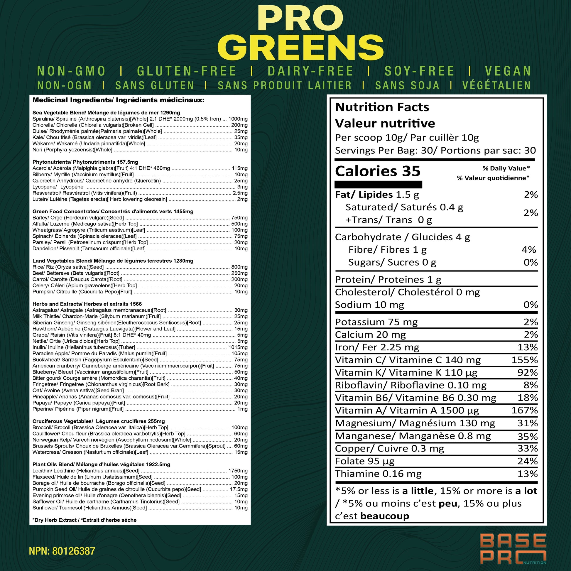 Spirulina/ Spiruline (Arthrospira platensis)[Whole] (2:1 DHE* 2000mg (0.5% Iron))1000mg; Chlorella/ Chlorelle (Chlorella vulgaris)[Broken Cell] 200mg; Dulse/ Rhodyménie palmée(Palmaria palmate)[Whole] 25mg; Kale/ Chou frisé (Brassica oleracea var. viridis)[Leaf] 35mg; Wakame/ Wakamé (Undaria pinnatifida)[Whole] 20mg; Nori (Porphyra yezoensis)[Whole] 10mg; Acerola/ Acérola (Malpighia glabra)([Fruit] 4:1 DHE* 460mg) 115mg; Bilberry/ Myrtille (Vaccinium myrtillus)[Fruit] 10mg; Quercetin Anhydrous/ Quercétine anhydre (Quercetin) 25mg; Lycopene/ Lycopène 3mg; Resveratrol/ Resvératrol (Vitis vinifera)(Fruit) 2.5mg; Lutein/ Lutéine (Tagetes erecta)[ Herb lowering oleoresin] 2mg; Barley/ Orge (Hordeum vulgare)[Seed] 750mg; Alfalfa/ Luzerne (Medicago sativa)[Herb Top] 500mg; Wheatgrass/ Agropyre (Triticum aestivum)[Leaf] 100mg; Spinach/ Épinards (Spinacia oleracea)[Leaf] 75mg; Parsley/ Persil (Petroselinum crispum)[Herb Top] 20mg; Dandelion/ Pissenlit (Taraxacum officinale)[Leaf] 10mg; Rice/ Riz (Oryza sativa)[Seed] 800mg; Beet/ Betterave (Beta vulgaris)[Root] 250mg; Carrot/ Carotte (Daucus Carota)[Root] 200mg; Celery/ Céleri (Apium graveolens)[Herb Top] 20mg; Pumpkin/ Citrouille (Cucurbita Pepo)[Fruit] 10mg; Astragalus/ Astragale (Astragalus membranaceus)[Root] 30mg; Milk Thistle/ Chardon-Marie (Silybum marianum)[Fruit] 25mg; Siberian Ginseng/ Ginseng sibérien(Eleutherococcus Senticosus)[Root] 25mg; Hawthorn/ Aubépine (Crataegus Laevigata)[Flower and Leaf] 15mg; Grape/ Raisin (Vitis vinifera)[Fruit] (8:1 DHE* 40mg) 5mg; Nettle/ Ortie (Urtica dioica)[Herb Top] 5mg; Inulin/ Inuline (Helianthus tuberosus)[Tuber] 1015mg; Paradise Apple/ Pomme du Paradis (Malus pumila)[Fruit] 105mg; Buckwheat/ Sarrasin (Fagopyrum Esculentum)[Seed] 75mg; American cranberry/ Canneberge américaine (Vaccinium macrocarpon)[Fruit] 75mg; Blueberry/ Bleuet (Vaccinium angustifolium)[Fruit] 50mg; Bitter gourd/ Courge amère (Momordica charantia)[Fruit] 40mg; Fringetree/ Fringetree (Chionanthus virginicus)[Root Bark] 30mg; Oat/ Avoine (Avena sativa)[Seed Bran] 30mg; Pineapple/ Ananas (Ananas comosus var. comosus)[Fruit] 20mg; Papaya/ Papaye (Carica papaya)[Fruit] 20mg; Piperine/ Pipérine (Piper nigrum)[Fruit] 1mg; Broccoli/ Brocoli (Brassica Oleracea var. Italica)[Herb Top] 100mg; Cauliflower/ Chou-fleur (Brassica oleracea var.botrytis)[Herb Top] 60mg; Norwegian Kelp/ Varech norvégien (Ascophyllum nodosum)[Whole] 20mg; Brussels Sprouts/ Choux de Bruxelles (Brassica Oleracea var.Gemmifera)[Sprout] 60mg; Watercress/ Cresson (Nasturtium officinale)[Leaf] 15mg; Lecithin/ Lécithine (Helianthus annuus)[Seed] 1750mg; Flaxseed/ Huile de lin (Linum Usitatissimum)[Seed] 100mg; Borage oil/ Huile de bourrache (Borago officinalis)[Seed] 20mg; Pumpkin Seed Oil/ Huile de graines de citrouille (Cucurbita pepo)[Seed] 17.5mg; Evening primrose oil/ Huile d'onagre (Oenothera biennis)[Seed] 15mg; Safflower Oil/ Huile de carthame (Carthamus Tinctorius)[Seed] 10mg; Sunflower/ Tournesol (Helianthus Annuus)[Seed] 10mg;